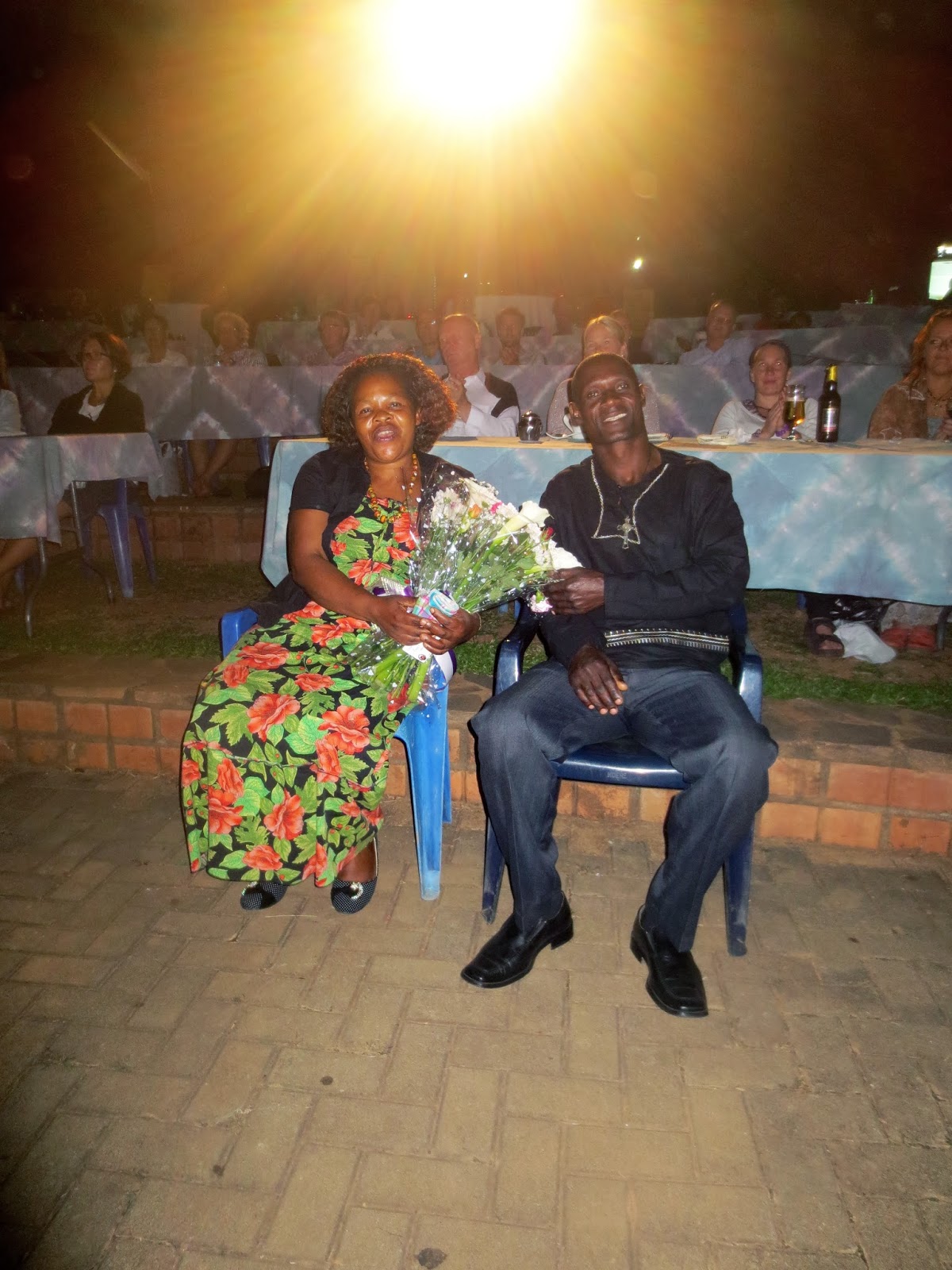 They arrive and are seated at a table in front. There is an MC who is very very funny and who has a whole history on Douglass' parents including the fact that his mother is a Bugandan princess related to the present Bugandan King. Then the real surprise hits them. They are called down to the stage and are put in chairs facing the stage. The MC announces to the crowd who they are, what they have done for the community and their own family...that Douglass' mother is a princess and that they are greatly loved and appreciated by their family and the community.